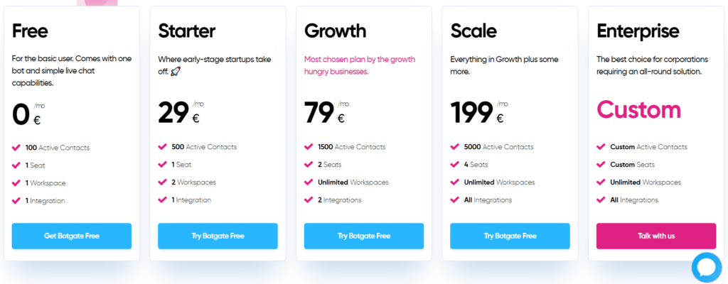 Their pricing starts at €29/month, and they offer a yearly plan for discounted pricing. With Botgate AI, you get a lot of features for your money, including: