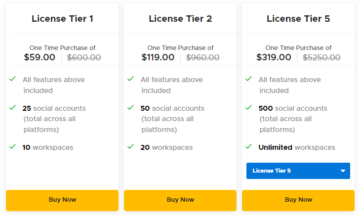 License Tier 2 - $119 has 50 social accounts and 20 workspaces.