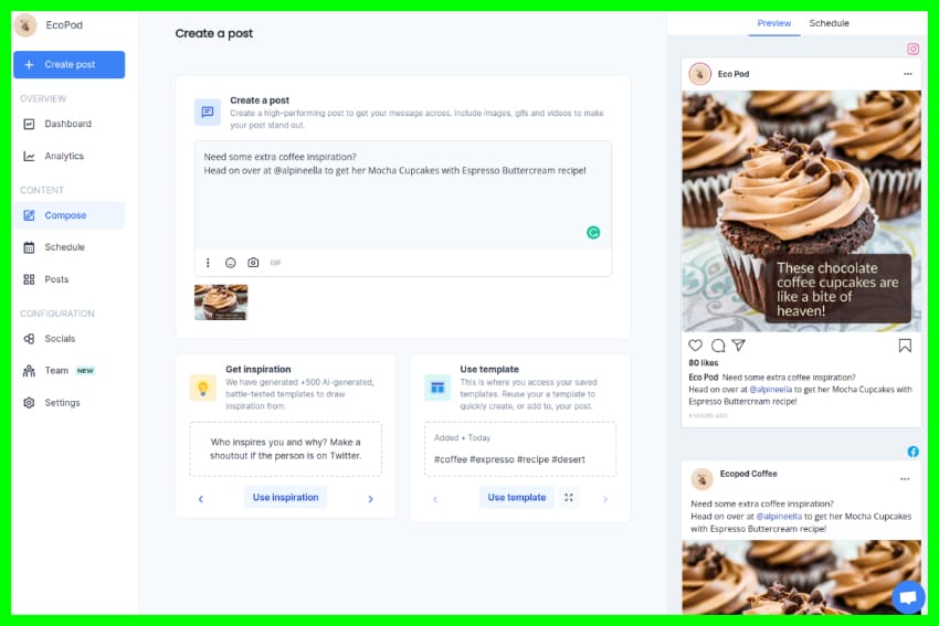 The Creator plan has great value for the money, with features like 14 days schedule into future, 20 days history, 30 Scheduled posts, 25 Save as drafts, 10 Create a posting plan, 8 custom labels, 15 post templates and 100 Inspiration templates. It also comes with analytics and post conditions.