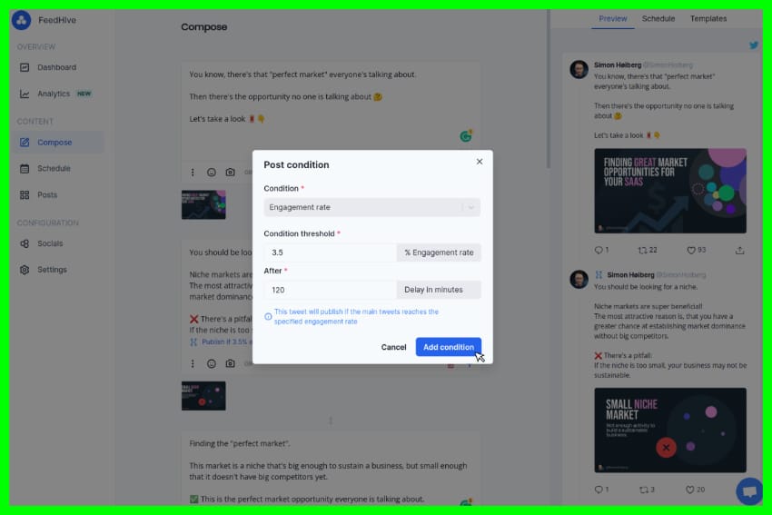 FeedHive helps you convert followers into paying customers. Capitalize on a high-performing post by setting conditions that trigger follow-up posts when your content hits a certain engagement threshold.