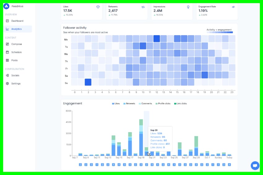 Feedhive is hands-down the best scheduler I have ever used. It's intuitive and has a clean interface that's easy to work with. It also allows for scheduling in advance and automating content throughout the day, so I don't have to constantly be checking my analytics dashboard to see what needs posting when.