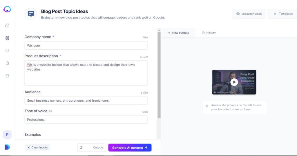 You need to enter Company name, description, audience, tone of voice and also few examples if possible and AI will generate the perfect topic ideas for you.