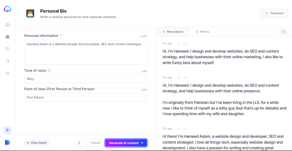 If I want to generate a bio for social media purposes, I will enter the following: