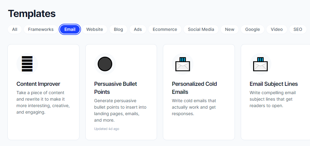 Helps you with Copywriting: Jasper AI uses Frameworks like PAS (Pain Agitate Solution), AIDA (Attention, Interest, Desire, Action) and few other frameworks to help you write copy that sells.
