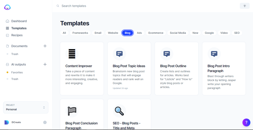 Blog templates available with Jasper AI: