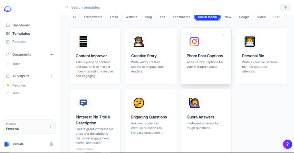 Jasper AI comes with many templates that you can use to create content. These templates are designed to help you write articles, social media posts, and more that are both high quality and engaging.