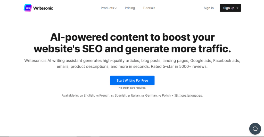 Writesonic is the AI writing assistant that helps you write high-quality content in seconds. With its advanced algorithms, Writesonic can generate articles, blog posts, landing pages, Google ads, Facebook ads, emails, product descriptions and more.