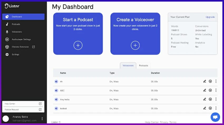 Listnr allows for unlimited recording time with each voice or language option so that you can find exactly what you're looking for in a matter of minutes—and then move on to more important tasks at hand without having to worry about finding new voice. Even if you’re not happy with your initial selection, there will be additional credits associated with re-recording until you get it right.