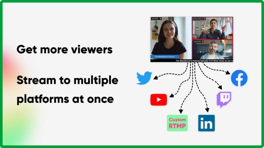 The best thing? You're not confined to a single platform! You may multistream to build your audience on YouTube, Twitch, Linkedin, Twitter, and other platforms simultaneously.
