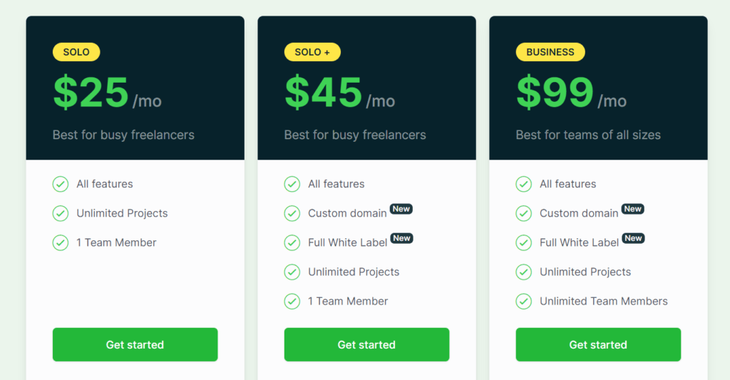 The Solo + plan is $60/month and includes 1 team member, unlimited contracts and projects, and access to client portals, Custom domain, and Full White Label.