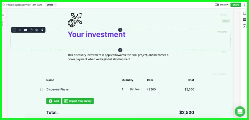 You can also add interactive modules, such as pricing tables, Q&As, approval buttons, embeds, file requests, and more.