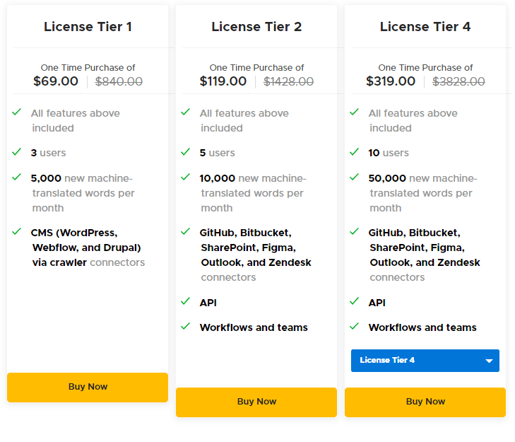 GitHub, Bitbucket, SharePoint, Figma, Outlook, and Zendesk connectors, API and Workflows and teams options are available from License tier 2 which will costs you 119$ but the words you can translate with that plan is just 10000 words.