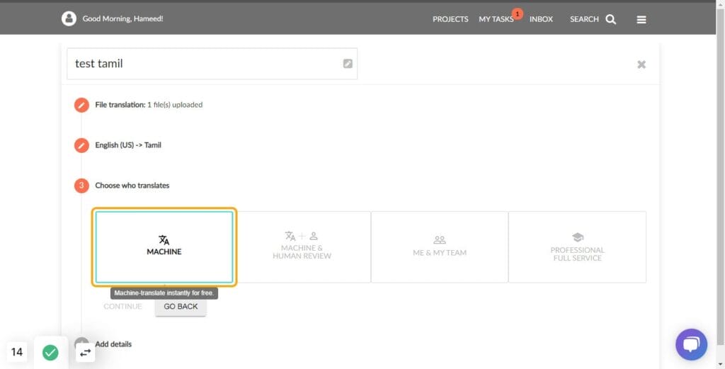 12. In next step, there are four options like machine. machine plus human review, me and my team, professional service. I am clicking on MACHINE