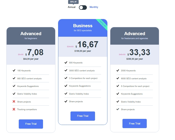 This gives you access to 500 keywords, 3000 SEO content analysis, 1 competitor for each project, keywords suggestions, Sistrix visibility index and share projects.
