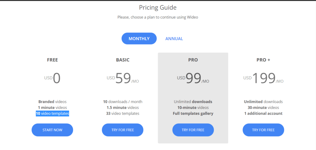 With Free plan, you can create unlimited 1 minute videos per month with Wideo branding. Free plan also includes 10 video templates which you can try before purchasing their premium plans.