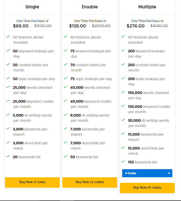Plus, all plans include SERP overview Ahref data, insights segmentation, export function, Golden keyword filter, sales per keyword simulation (ESKP), competitor headline generators, report sharable links, and the ability to import content from multiple sources.