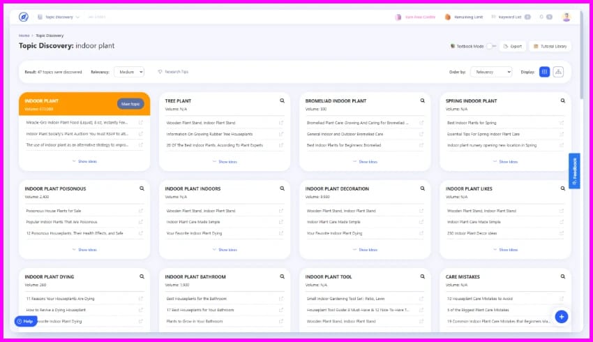 With the Basic plan, you get 50 keyword searches per day, 25,000 monthly keyword credits, 50 content briefs, 5,000 A.I writing words, and 50 topic searches.