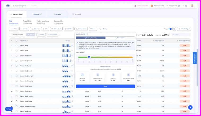 Plus, you'll get keyword searches, SERP overview Ahref data, insights segmentation, export function, Golden keyword filter, sales per keyword simulation (ESKP), competitor headline generators, and report sharable links.