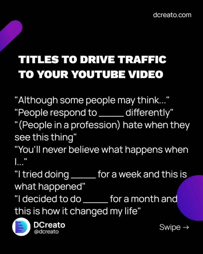 Youtube has become so popular that it now accounts for 40% of all internet traffic. Here are a few titles to drive traffic to your Youtube video: